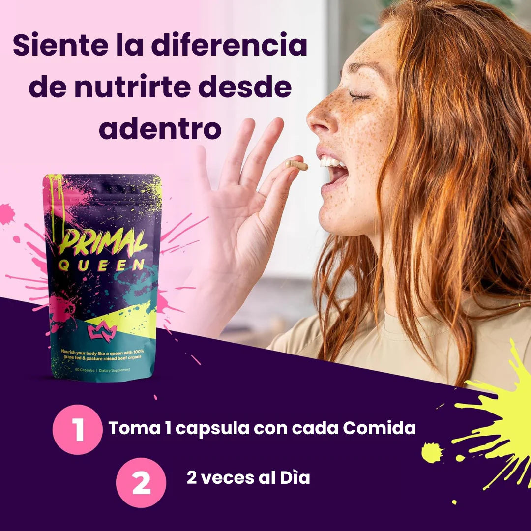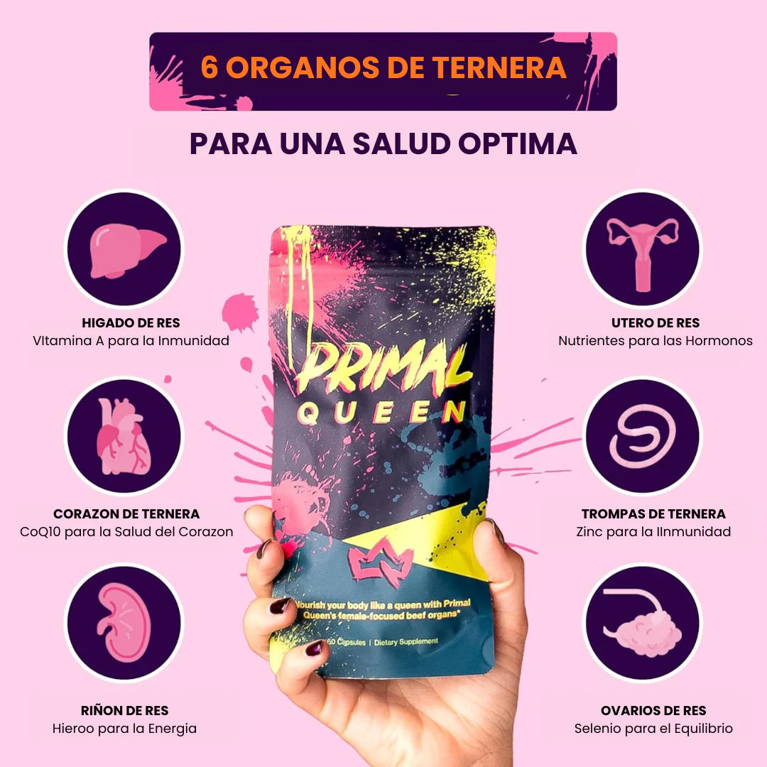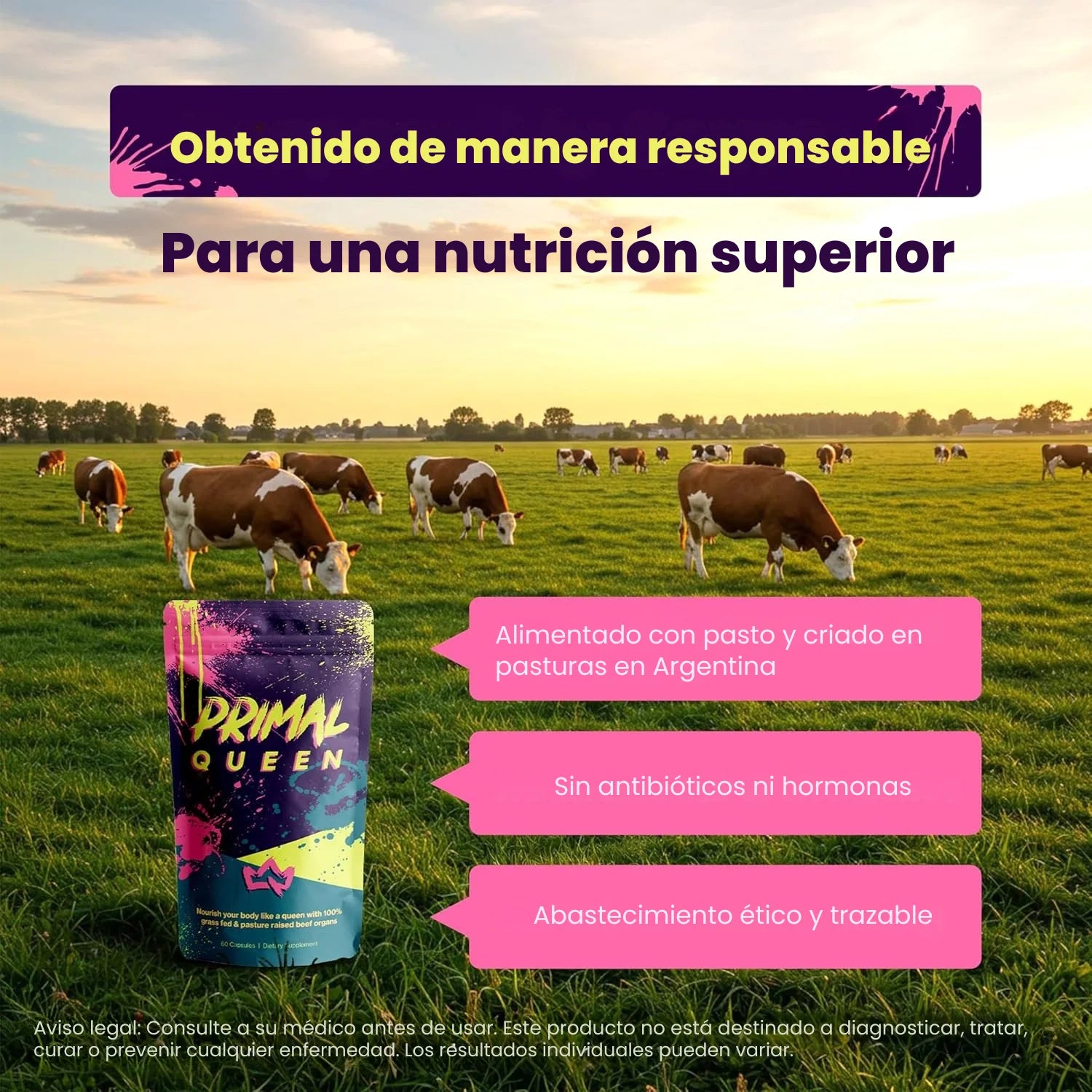 Cada cápsula de Primal Queen contiene nutrientes naturales de hígado, corazón, riñón, páncreas, bazo y ovario bovino.